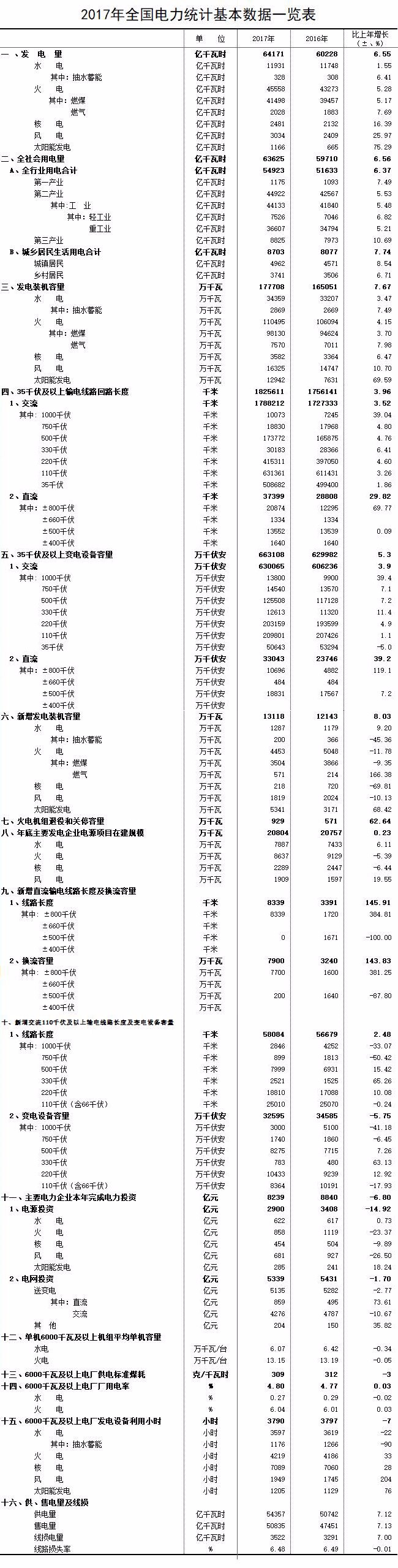 日前中電聯(lián)行業(yè)發(fā)展與環(huán)境資源部發(fā)布了《2017年電力統(tǒng)計(jì)基本數(shù)據(jù)一覽表》,數(shù)據(jù)顯示2017年全社會(huì)用電量為63625億千瓦時(shí),比2016年增長(zhǎng)6.56%;主要電力企業(yè)本年完成電力投資共計(jì)8239億元,比2016年減少6.8億元。詳情如下: