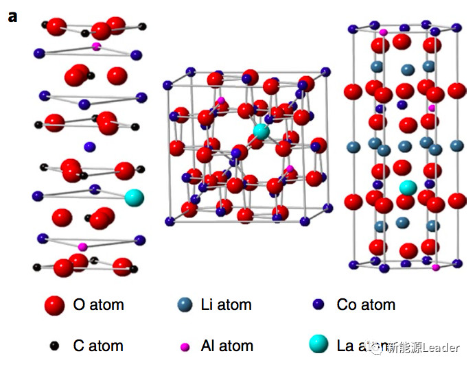 鈷酸鋰材料的理論容量為274mAh/g,但在實際使用中為了保持鈷酸鋰的結構穩(wěn)定性和良好的循環(huán)性能,我們一般將充電電壓限制在4.2V左右,因此鈷酸鋰的實際使用容量也就在140mAh/g左右,近年來材料廠家通過表面包覆合、元素摻雜等手段提升了鈷酸鋰材料的結構穩(wěn)定性,充電電壓可以提升至4.35V,從而使得鈷酸鋰材料的可逆容量達到165mAh/g左右,但是這仍然無法滿足高比能鋰離子電池的需求,為此華為中央研究院聯(lián)合美國阿貢國家實驗室通過La和Al摻雜,將LiCoO2的穩(wěn)定電壓提高到了4.5V,可逆容量達到190mAh/g,其中La能夠增加LCO材料在c軸方向上的晶胞參數(shù),Al則能夠起到促進Li+擴散、穩(wěn)定晶體結構和防止LCO材料相變的作用,兩者相互作用顯著改善了LCO材料在高電壓下的結構穩(wěn)定性,循環(huán)50次后仍然能夠保持96%的容量,并使得LCO材料的倍率性能得到了大幅提高。