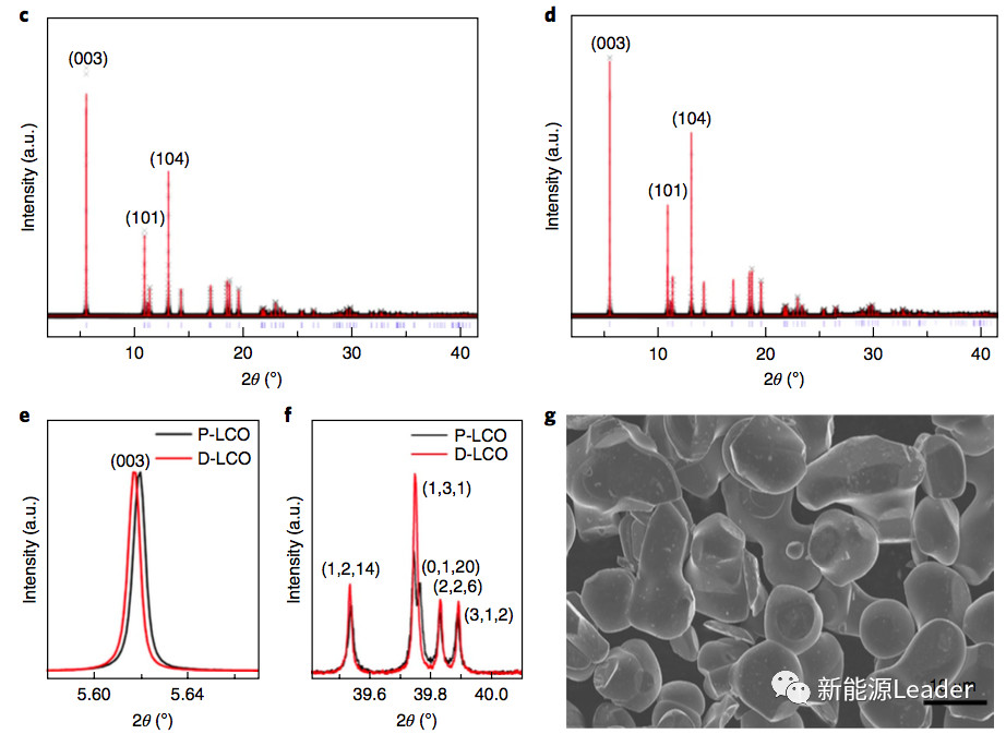 材料的dQ/dV曲線是反應材料相變的重要參考點,從沒有摻雜的LCO材料的dQ/dV曲線(上圖e)上能夠看到,材料在4.1V、4.2V和4.46V出現(xiàn)了三個峰值,其中4.1V、4.2V對應的為材料的有序-無序結構轉變,而在4.46V處的峰則表示材料進一步發(fā)生相變,而我們反觀經(jīng)過摻雜處理的LCO材料在相同的電壓范圍內沒有出現(xiàn)峰值,表明La和Al摻雜很好的抑制了LCO材料的相變。