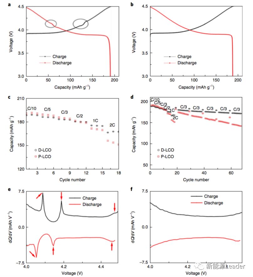 華為中央研究院和阿貢實驗室的科研人員們緊密合作,通過在LCO材料中摻入少量的La和Al很好的抑制了在脫Li過程中LCO材料發(fā)生的相變,減輕了顆粒內部和顆粒之間的應力產(chǎn)生和積累,從而減少了循環(huán)過程中LCO顆粒表面裂紋的產(chǎn)生,極大的提升了LCO材料在4.5V高電壓下的循環(huán)穩(wěn)定性,同時使得LCO材料的可逆容量達到190mAh/g,遠高于目前的高壓鈷酸鋰材料(4.35V,165mAh/g)。同時La、Al摻雜還顯著的提升了Li+在LCO材料那的擴散速度,提升了材料的倍率性能。最后,小編要說一句:“科研不是口號,喊喊就行了,科研是投入真金白銀搞出來的,向華為致敬!”