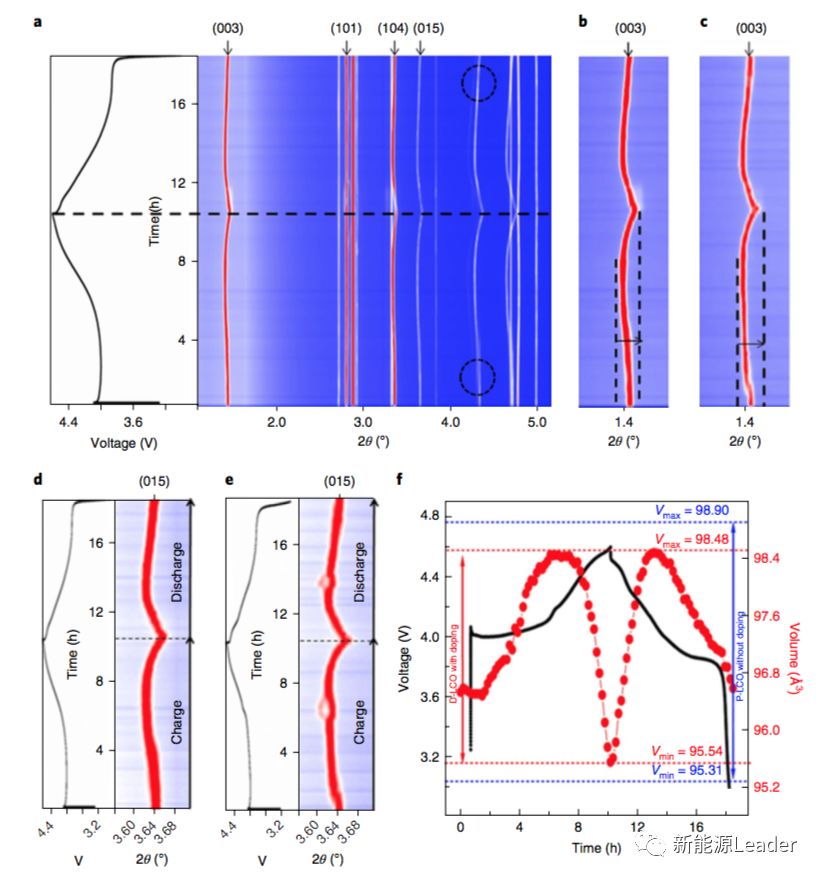 原位X涉嫌衍射分析揭示了LA、Al摻雜提高LCO材料循環(huán)性能的原因,從下圖中能夠看到摻雜后的LCO材料除了在低電壓范圍內有一個絕緣體-金屬導體的轉變外,在整個電壓范圍內都是單相固溶體結構,而沒有摻雜的LCO材料在整個電壓范圍內發(fā)生了一系列的相變反應。從下圖b和c來看在脫Li的過程中沒有摻雜的LCO材料的晶胞參數(shù)c變化明顯要好于經(jīng)過摻雜的LCO材料,因此導致沒有摻雜的LCO在脫Li過程中晶胞體積膨脹達到3.63%,而經(jīng)過摻雜處理的LCO僅為2.97%,這極大的減少了LCO在脫Li過程中顆粒內部和顆粒之間應力的產(chǎn)生,提升了LCO材料的循環(huán)性能。