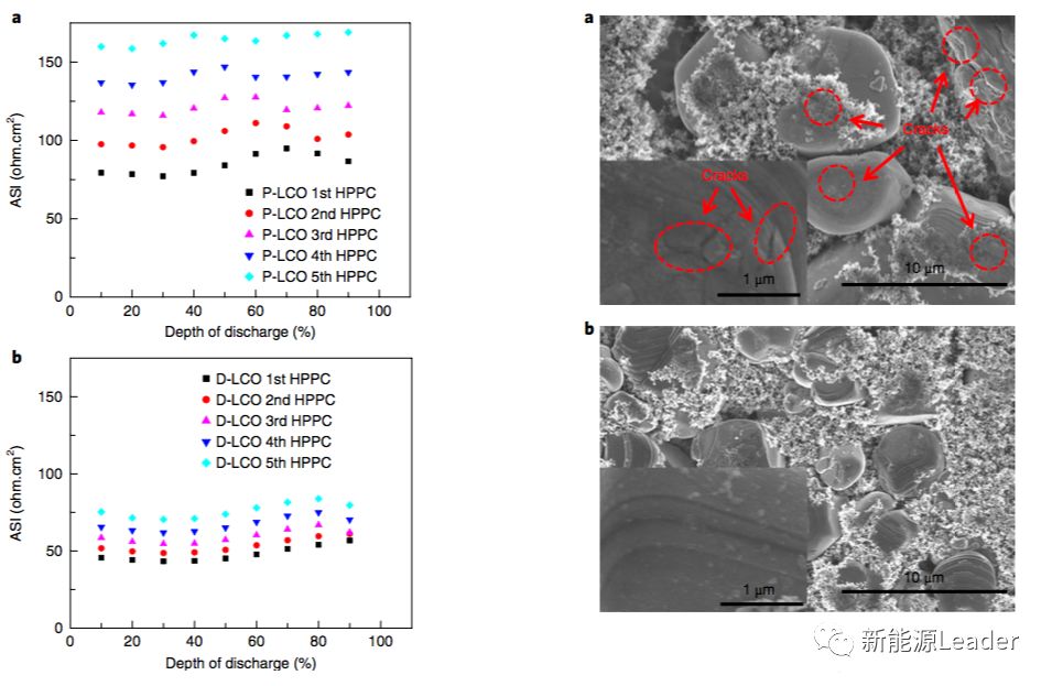 通過對LCO材料的比面電阻進行分析發(fā)現(xiàn),沒有摻雜處理的LCO材料在循環(huán)過程中比面電阻上升的很快,而經(jīng)過摻雜處理后的LCO材料循環(huán)過程中電極的比面電阻僅有輕微的升高,這主要是因為La、Al摻雜很好的抑制了脫Li過程中的LCO材料的相變,從而減輕了材料中的應力,避免了循環(huán)過程中LCO材料裂紋的產(chǎn)生。而沒有摻雜的LCO材料由于脫Li過程中LCO中存在多種相變,因此導致了LCO材料在循環(huán)過程中積累了大量的應力,從而在顆粒表面產(chǎn)生了許多的裂縫,從而加劇了電解液在LCO材料表面的分解,導致電阻迅速增加。