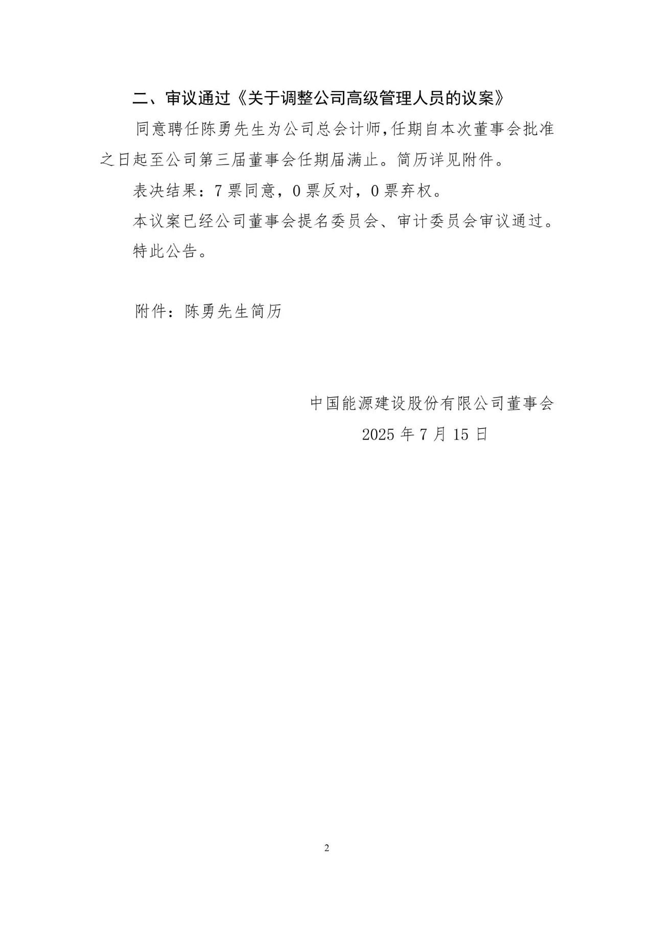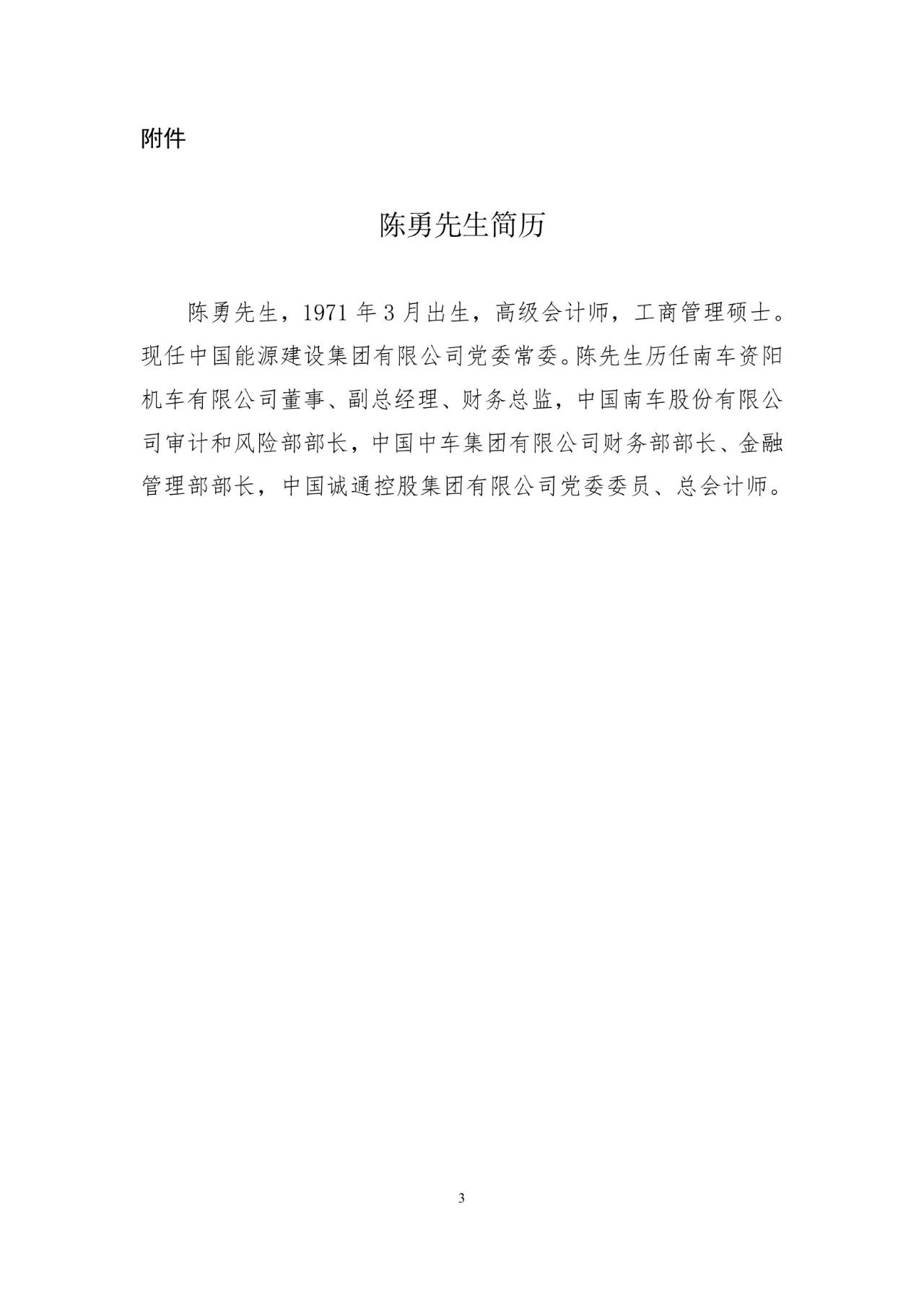 陳勇先生,1971年3月出生,高級(jí)會(huì)計(jì)師,工商管理碩士。現(xiàn)任中國(guó)能源建設(shè)集團(tuán)有限公司黨委常委。陳先生歷任南車資陽(yáng)機(jī)車有限公司董事、副總經(jīng)理、財(cái)務(wù)總監(jiān),中國(guó)南車股份有限公司審計(jì)和風(fēng)險(xiǎn)部部長(zhǎng),中國(guó)中車集團(tuán)有限公司財(cái)務(wù)部部長(zhǎng)、金融管理部部長(zhǎng),中國(guó)誠(chéng)通控股集團(tuán)有限公司黨委委員、總會(huì)計(jì)師。