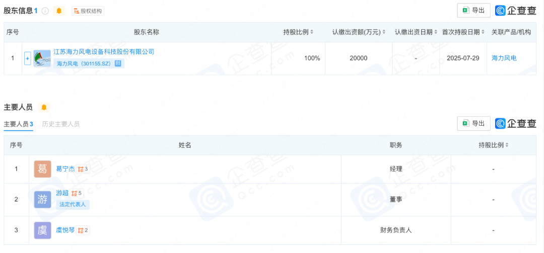 近日,海力海上風(fēng)電裝備(溫州)有限公司成立,法定代表人為游超,注冊資本為20000萬元。新公司經(jīng)營范圍包含:新能源原動(dòng)設(shè)備制造;海上風(fēng)電相關(guān)裝備銷售;海洋工程裝備制造;海洋工程裝備銷售;海洋工程平臺裝備制造;海洋能系統(tǒng)與設(shè)備銷售;海洋能系統(tǒng)與設(shè)備制造;海洋工程關(guān)鍵配套系統(tǒng)開發(fā);海上風(fēng)電相關(guān)系統(tǒng)研發(fā);風(fēng)電場相關(guān)系統(tǒng)研發(fā);風(fēng)電場相關(guān)裝備銷售等。企查查股權(quán)穿透顯示,該公司由江蘇海力風(fēng)電設(shè)備科技股份有限公司100%持股。