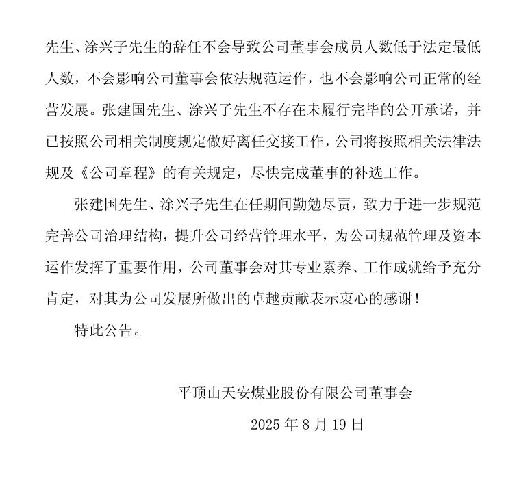 8月19日,平煤股份發(fā)布公告稱,公司董事會近日收到公司董事張建國先生、涂興子先生的書面辭職申請。張建國先生因工作調(diào)整原因、涂興子先生因退休原因,向公司董事會申請辭去公司第九屆董事會董事及戰(zhàn)略委員會委員職務(wù)。根據(jù)《公司法》《公司章程》的有關(guān)規(guī)定,張建國先生、涂興子先生的辭職申請自送達(dá)公司董事會之日生效。張建國先生、涂興子先生辭職后,不再擔(dān)任公司其他職務(wù)。