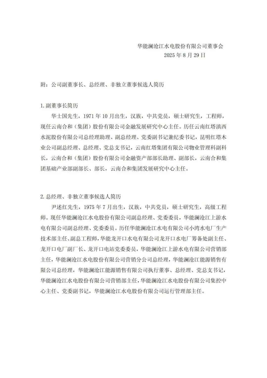 8月28日,華能瀾滄江水電股份有限公司(以下簡稱“華能水電”)公告稱,華能水電于8月28日召開第四屆董事會第十次會議,審議通過了《關(guān)于選舉公司副董事長的議案》《關(guān)于聘任公司高級管理人員的議案》《關(guān)于選舉公司非獨(dú)立董事候選人的議案》。