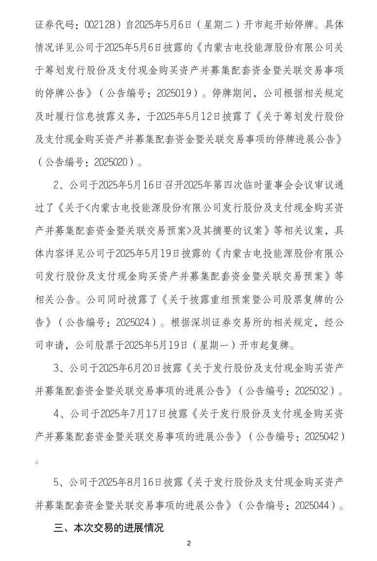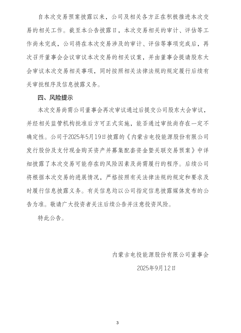自本次交易預(yù)案披露以來,電投能源及相關(guān)各方正在積極推進(jìn)本次交易的相關(guān)工作。截至本公告披露日,本次交易相關(guān)的審計、評估等工作尚未完成,電投能源將在本次交易涉及的審計、評估等事項完成后,再次召開董事會會議審議本次交易的相關(guān)議案,并由董事會提請股東大會審議本次交易相關(guān)事項,同時按照相關(guān)法律法規(guī)的規(guī)定履行后續(xù)有關(guān)審批程序及信息披露義務(wù)。