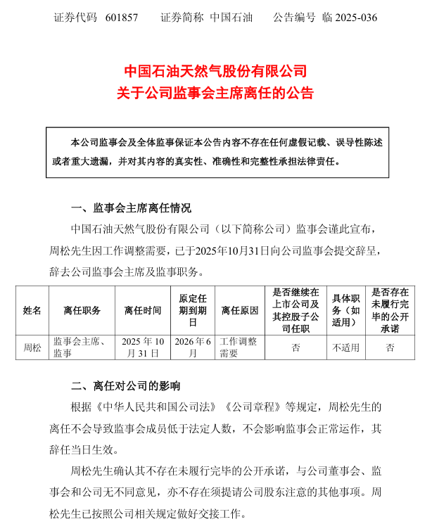 中國(guó)石油發(fā)布公告稱,公司監(jiān)事會(huì)宣布,周松先生因工作調(diào)整需要,已于2025年10月31日向公司監(jiān)事會(huì)提交辭呈,辭去公司監(jiān)事會(huì)主席及監(jiān)事職務(wù)。