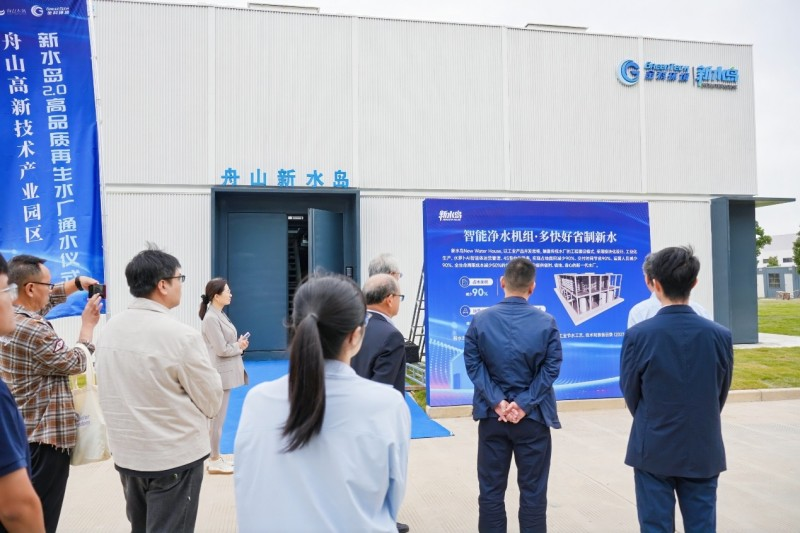 通水儀式結束后,與會人員共同實地考察了新水島 2.0 水廠。該項目占地面積僅 300 平方米,采用金科環(huán)境自主研發(fā)的 “新水島 2.0” 工程模塊化產品與 “水蘿卜 AI 智能體” 運營管理平臺,以污水處理廠出水為水源,通過 “超濾 + 反滲透” 先進處理工藝,使供水水質遠超《城市污水再生利用 — 工業(yè)用水水質》標準,完全滿足國內外光伏企業(yè)高標準生產用水需求。項目總設計產水規(guī)模達 2 萬噸 / 天,其中一期產水規(guī)模 5000 噸 / 天,服務范圍覆蓋舟山高新區(qū)內新能源、化工等重點工業(yè)企業(yè),目前一期產出的再生水已主要供應園區(qū)內光伏企業(yè),為當地新能源產業(yè)發(fā)展注入了綠色動力。