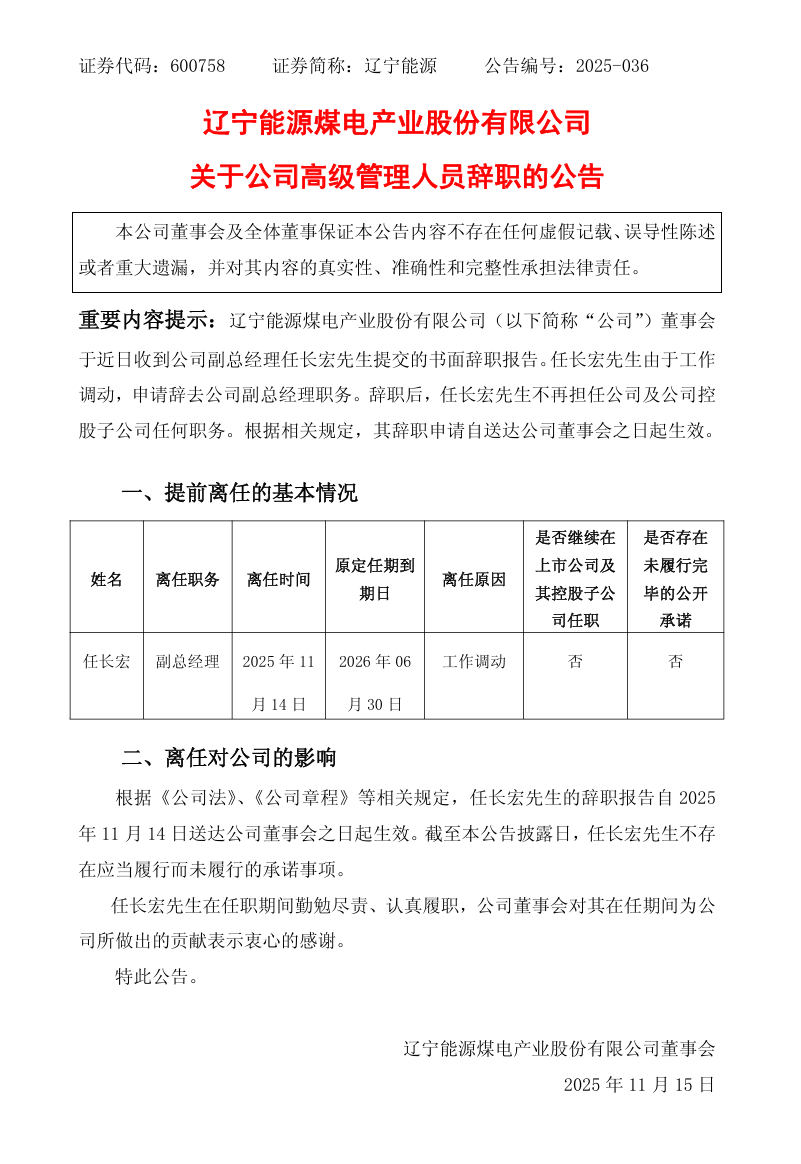 11月14日,遼寧能源發(fā)布公告稱,公司董事會于近日收到公司副總經(jīng)理任長宏先生提交的書面辭職報告。任長宏先生由于工作調(diào)動,申請辭去公司副總經(jīng)理職務。辭職后,任長宏先生不再擔任公司及公司控股子公司任何職務。