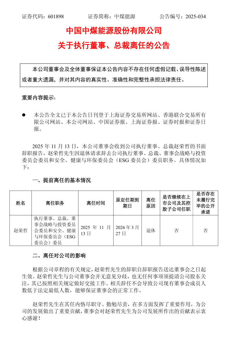 11月14日,中煤能源發(fā)布公告稱,11月13日,公司董事會收到公司執(zhí)行董事、總裁趙榮哲的書面辭職報告,趙榮哲先生因退休請求辭去公司執(zhí)行董事、總裁、董事會戰(zhàn)略與投資委員會委員和安全、健康與環(huán)保委員會(ESG委員會)委員職務(wù)。