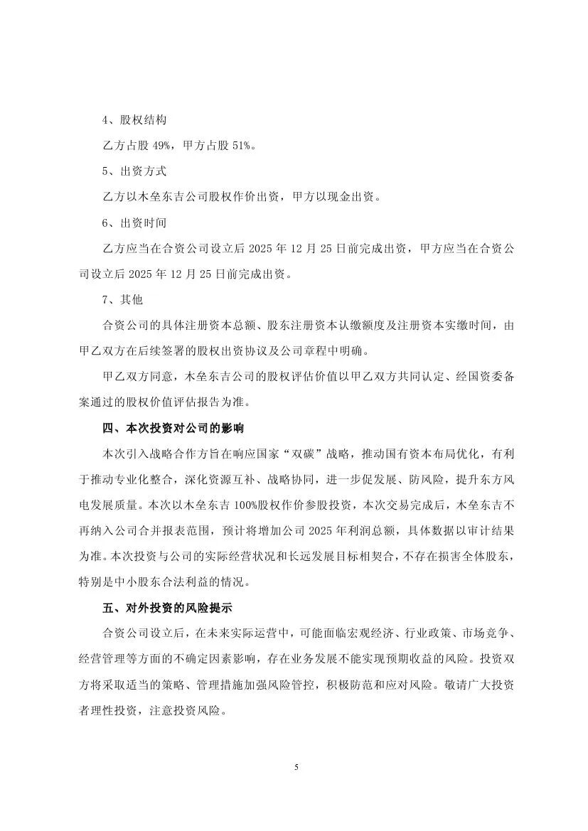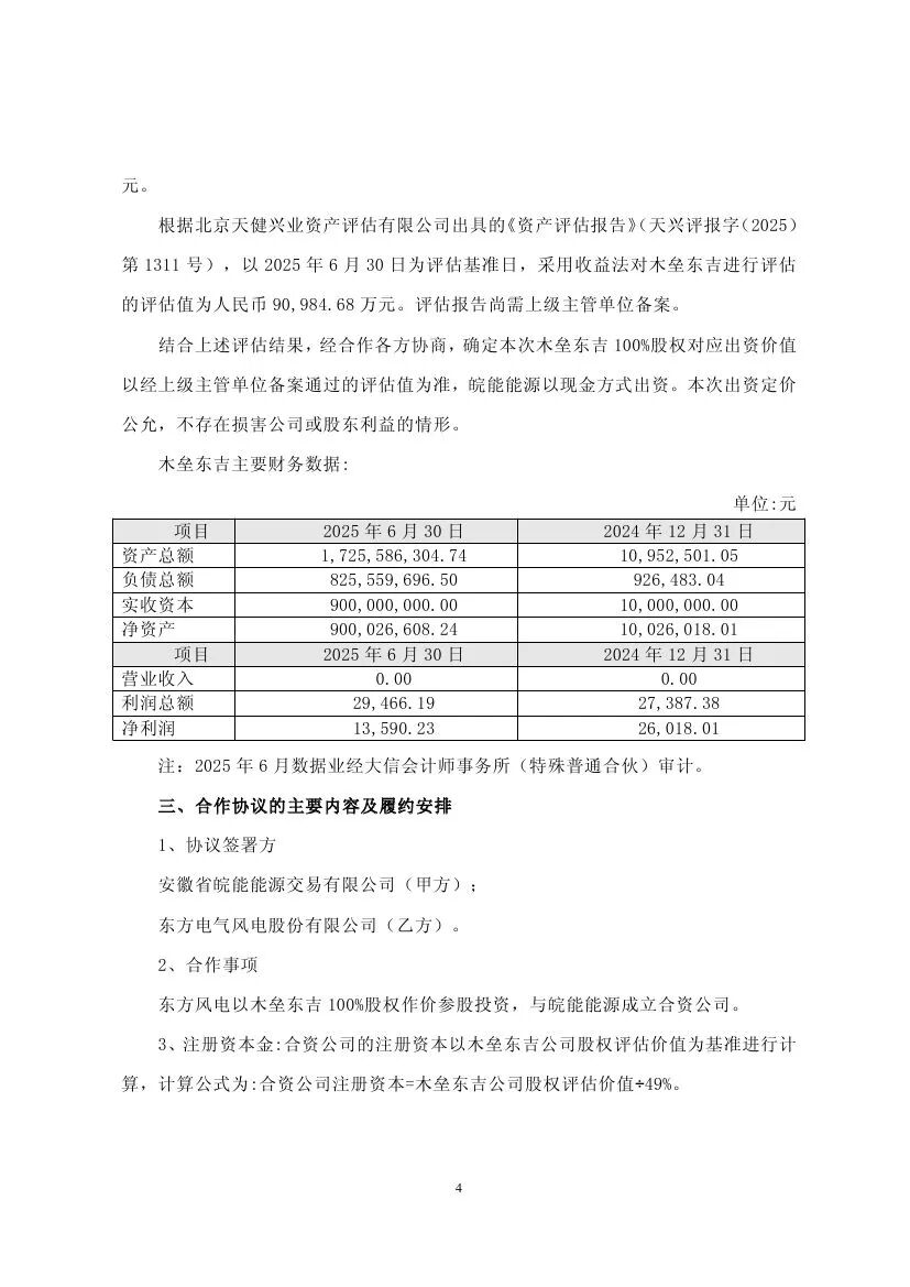 東方電氣控股子公司與皖能能源共同成立合資公司,東方風電持股49%,皖能能源持股51%。合資公司注冊資本為:185,683.0205萬元,東方風電以木壘東吉新能源有限公司100%股權作價出資,根據北京天健興業(yè)資產評估有限公司出具的資產評估報告,基于評估基準日2025年6月30日,木壘東吉新能源有限公司評估后的股東全部權益價值為90,984.68萬元,皖能能源以94,698.3405 萬元現(xiàn)金出資。
