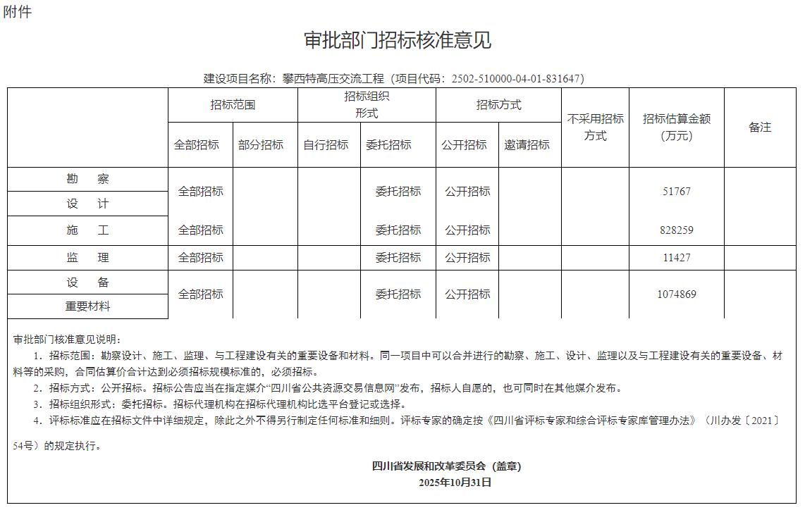報(bào)來《關(guān)于呈批核準(zhǔn)攀西特高壓交流工程的請示》(川電發(fā)展〔2025〕181號)收悉。經(jīng)研究,現(xiàn)將攀西特高壓交流工程(項(xiàng)目代碼:2502-510000-04-01-486846)核準(zhǔn)事項(xiàng)批復(fù)如下: