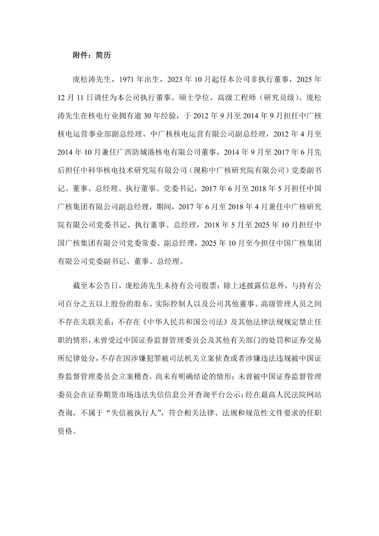 龐松濤先生在核電行業(yè)擁有逾30年經(jīng)驗,于2012年9月至2014年9月?lián)沃袕V核核電運營事業(yè)部副總經(jīng)理、中廣核核電運營有限公司副總經(jīng)理,2012年4月至2014年10月兼任廣西防城港核電有限公司董事,2014年9月至2017年6月先后擔(dān)任中科華核電技術(shù)研究院有限公司(現(xiàn)稱中廣核研究院有限公司)黨委副書記、董事、總經(jīng)理、執(zhí)行董事、黨委書記,2017年6月至2018年5月?lián)沃袊鴱V核集團有限公司副總經(jīng)理,期間,2017年6月至2018年4月兼任中廣核研究院有限公司黨委書記、執(zhí)行董事、總經(jīng)理,2018年5月至2025年10月?lián)沃袊鴱V核集團有限公司黨委常委、副總經(jīng)理,2025年10月至今擔(dān)任中國廣核集團有限公司黨委副書記、董事、總經(jīng)理。