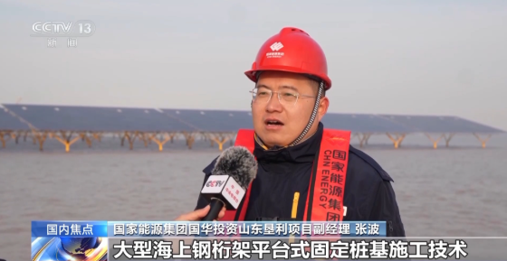 國家能源集團國華投資山東墾利項目副經(jīng)理 張波:項目在全國創(chuàng)新應用大型海上鋼桁架平臺式固定樁基施工技術,采用“四樁基礎+光伏平臺”優(yōu)化結構,平臺傾角為精準調(diào)校的15度,不僅能抵抗11級強風和冬季冰情,還能節(jié)約項目用鋼量超10%,為同類項目開發(fā)建設提供經(jīng)驗借鑒。