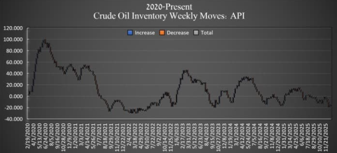 根據(jù)美國石油協(xié)會(API)2025年12月30日公布的數(shù)據(jù),截至2025年12月26日當周,美國原油庫存增加了170萬桶,為連續(xù)第二周增長。此前一周的庫存增幅為240萬桶。今年迄今,美國原油庫存整體呈現(xiàn)凈減少510萬桶的趨勢。