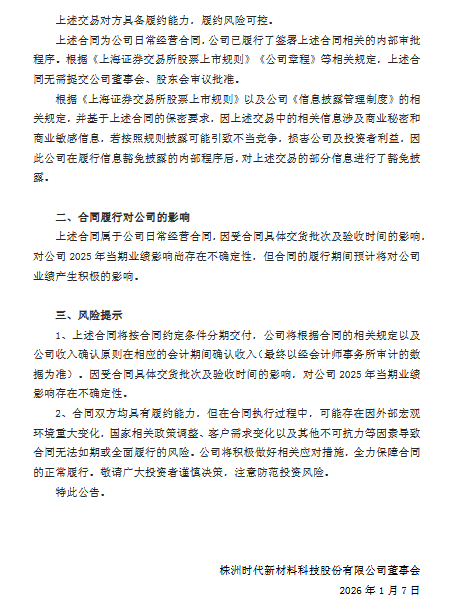 根據(jù)公告顯示,時(shí)代新材2025年10月1日—2025年12月31日與風(fēng)電各大主機(jī)廠簽訂《葉片銷售合同》,時(shí)代新材向各大廠商銷售風(fēng)力發(fā)電葉片及相關(guān)服務(wù),合同金額總計(jì)約合人民幣33.2億元(含稅價(jià)),其中海上風(fēng)電項(xiàng)目合同金額1.9億元,陸上風(fēng)電項(xiàng)目合同金額33.2億元。