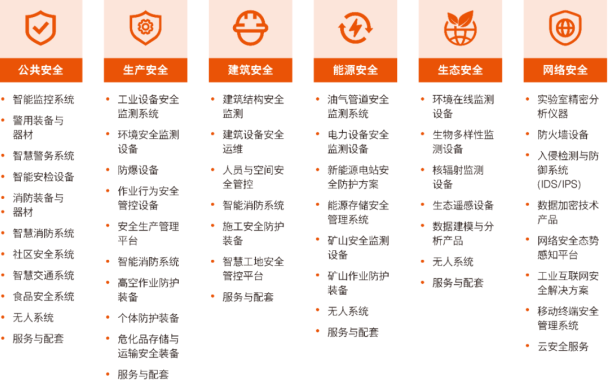 生產(chǎn)安全: 工業(yè)設(shè)備安全監(jiān)測(cè)系統(tǒng)、環(huán)境安全監(jiān)測(cè)設(shè)備、防爆設(shè)備、作業(yè)行為安全管控設(shè)備、安全生產(chǎn)管理平臺(tái)、智能消防系統(tǒng)、高空作業(yè)防護(hù)裝備、個(gè)體防護(hù)裝備、危化品存儲(chǔ)與運(yùn)輸安全裝備、服務(wù)與配套