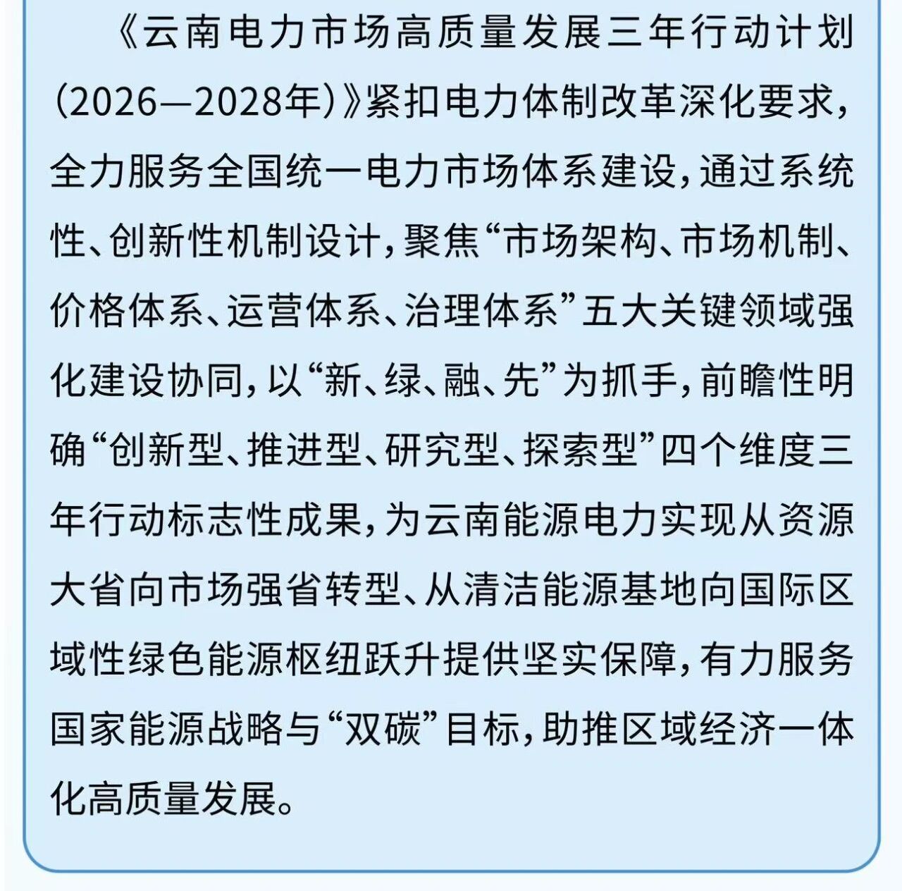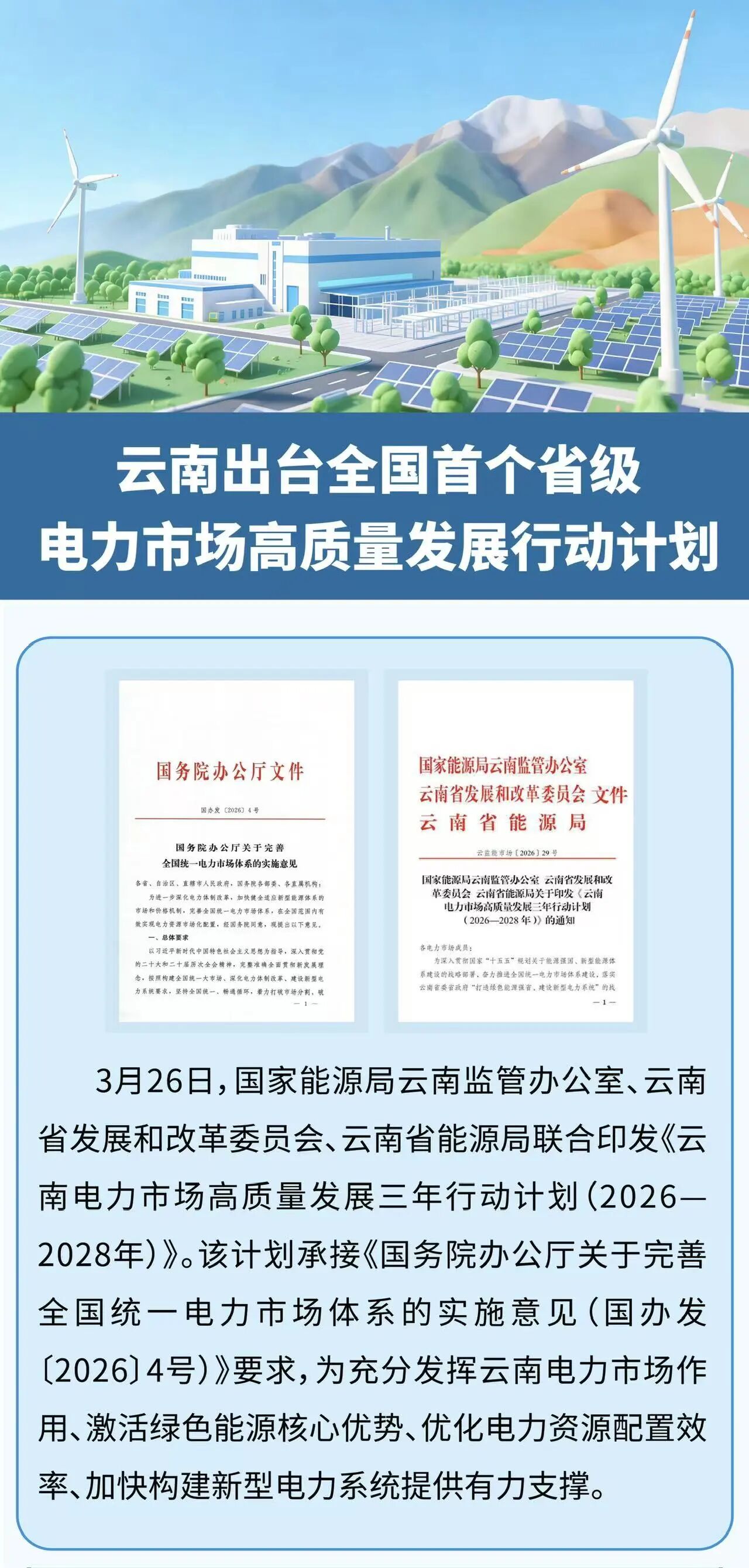 3月26日,國家能源局云南監(jiān)管辦公室、云南省發(fā)展和改革委員會、云南省能源局聯(lián)合印發(fā)《云南電力市場高質(zhì)量發(fā)展三年行動計劃(2026一2028年)》。