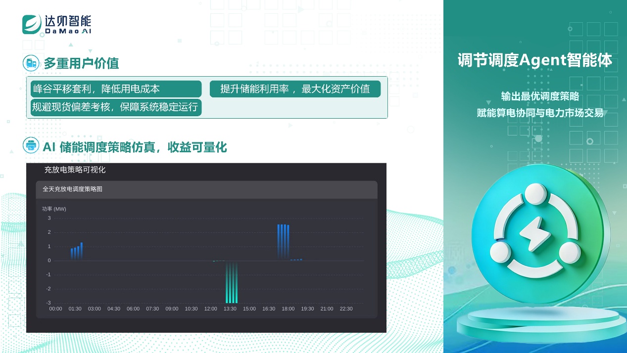 調(diào)節(jié)調(diào)度Agent :承擔算電協(xié)同與儲能管理核心職能,自動生成最優(yōu)充放電策略,實現(xiàn)峰谷套利、負荷平抑,最大化儲能資產(chǎn)價值,并保障負荷運行與電網(wǎng)接入雙穩(wěn)定。
