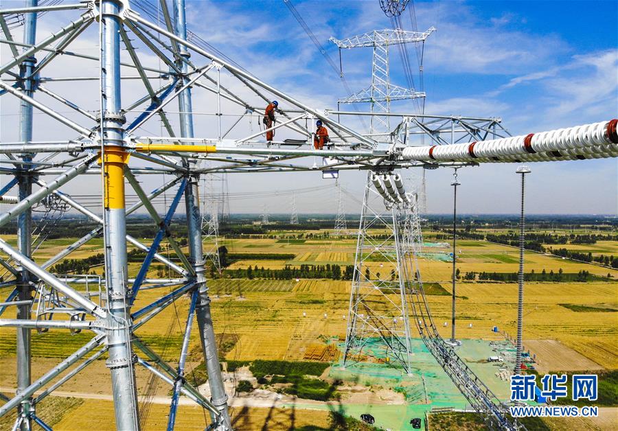 6月29日,施工人員在做投運(yùn)前的復(fù)檢驗(yàn)收工作(無(wú)人機(jī)拍攝)。原標(biāo)題:雄安新區(qū)首個(gè)大型電網(wǎng)建設(shè)工程投入運(yùn)營(yíng)