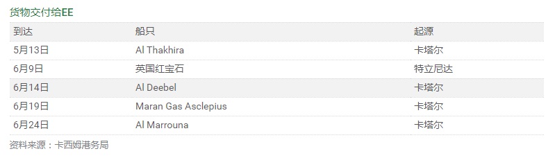 交付給EE終端的五種貨物中有四種是從卡塔爾運(yùn)來的,另一種是從特立尼達(dá)和多巴哥運(yùn)來的,發(fā)貨人被列為Gas Natural。
