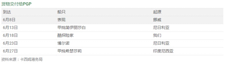 巴基斯坦于5月在旁遮普地區(qū)的Haveli Bahadur Shah和Bhikki完成了兩座燃?xì)獍l(fā)電廠的投產(chǎn)。這產(chǎn)生了對(duì)六種液化天然氣貨物的充足需求,這些貨物已交付給PGP終端。位于旁遮普邦的Balloki的第三座發(fā)電廠預(yù)計(jì)將在未來幾個(gè)月內(nèi)啟動(dòng)。這將為電網(wǎng)增加約3.6 GW的新容量,并有助于減少停電的可能性。