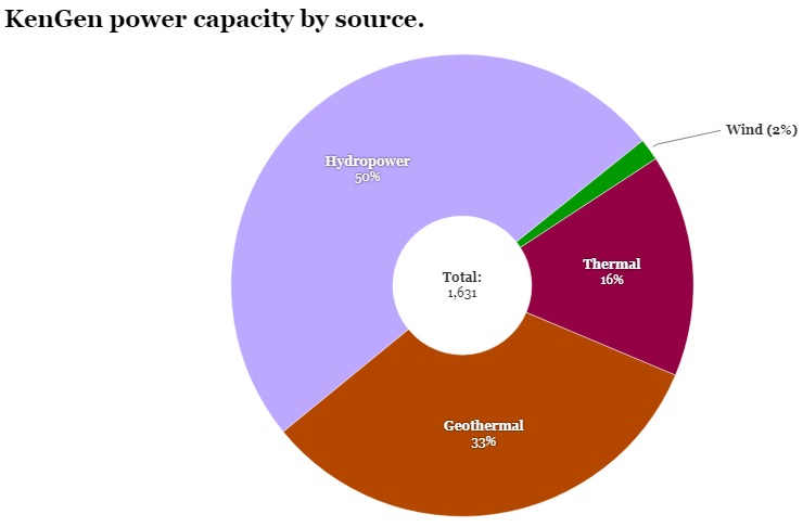目前,KenGen的總發(fā)電量為1,631兆瓦,其中一半是水力發(fā)電(818兆瓦),地熱(534兆瓦),其次是熱能(254兆瓦)和風力(25兆瓦)。
