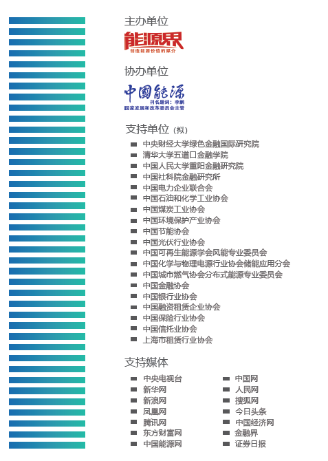 高度契合國(guó)務(wù)院、國(guó)家發(fā)改委和國(guó)家能源局等部委深入推進(jìn)能源“四個(gè)革命”,做大、做強(qiáng)“能源+金融”產(chǎn)業(yè)合作模式等指示精神,第二屆“能金會(huì)”亦將向解決能源行業(yè)融資難及融資成本高難題,拓展金融行業(yè)投資機(jī)會(huì),加大金融與能源優(yōu)質(zhì)項(xiàng)目合作力度方面發(fā)起全新“沖刺”