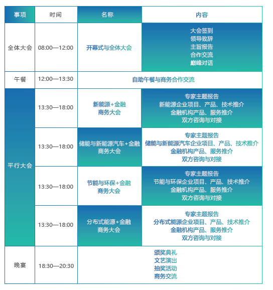 打破常規(guī),創(chuàng)新融合,是“能金會(huì)”一大特色。資料顯示,第二界“能金會(huì)”共分三大板塊,一是“開幕式與全體大會(huì)”,二是“平行大會(huì)”,三是“晚宴”,主題清晰、層次分明,而不失“有料”、“有溫度”。其中,“平行大會(huì)”分為“新能源+金融商務(wù)大會(huì)”、“儲(chǔ)能與新能源汽車+金融商務(wù)大會(huì)”、“節(jié)能與環(huán)保+金融商務(wù)大會(huì)”和“分布式能源+金融商務(wù)大會(huì)”四個(gè)單元,每個(gè)單元分別設(shè)置了專家主題報(bào)告、相關(guān)企業(yè)項(xiàng)目、產(chǎn)品技術(shù)推介、金融機(jī)構(gòu)產(chǎn)品、服務(wù)推介、和雙方咨詢與對(duì)接等環(huán)節(jié),將能源與金融業(yè)之間的無(wú)縫對(duì)接落到了實(shí)處。