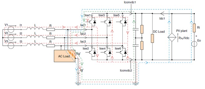 在交直流混合電網(wǎng)中直流負(fù)載側(cè),顯然普通AC型剩余電流保護(hù)器無法完成保護(hù),需要使用DC-RCD進(jìn)行直流漏電保護(hù),然而目前直流漏電保護(hù)還并未推廣和市場(chǎng)化,國內(nèi)也尚無相關(guān)標(biāo)準(zhǔn)。實(shí)際上,在交直流混合微電網(wǎng)中,漏電成分是非常復(fù)雜的,我們來看下ABB對(duì)于交直流混合微電網(wǎng)中交流側(cè)接地故障的仿真模型。