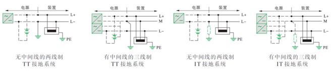 與交流配電系統(tǒng)一樣,直流配電系統(tǒng)的接地形式也分為TN、TT、IT,由于直流用電設(shè)備對(duì)供電電源要求有可能是負(fù)電源或正電源,因此配電系統(tǒng)中有兩條電源線的兩線制或增加一條中間導(dǎo)線(M線)的三線配電制。下圖3為配電系統(tǒng)常用的TT、IT接地形式的系統(tǒng)簡圖。