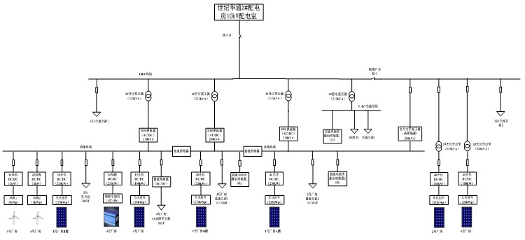 隨著分布式發(fā)電和儲(chǔ)能的大量應(yīng)用和直流負(fù)荷的快速增長,使得直流配電越來越受關(guān)注。直流配電系統(tǒng)將會(huì)成為未來配電技術(shù)的一個(gè)重要組成部分。2017年8月26日,國家863課題“高密度分布式能源接入直流混合微電網(wǎng)關(guān)鍵技術(shù)”示范工程在浙江上虞投入運(yùn)行,實(shí)現(xiàn)國內(nèi)首次交直流混合微電網(wǎng)用戶側(cè)運(yùn)行,工程改造或接入分布式光伏總?cè)萘?.4MW,2套5kW風(fēng)力發(fā)電系統(tǒng),1套250kW/800kWh鉛酸電池儲(chǔ)能系統(tǒng),1套交直流微電網(wǎng)功率變換與網(wǎng)架系統(tǒng),系統(tǒng)內(nèi)交流最高負(fù)荷約1.2MW,直流最高負(fù)荷約0.9MW。下圖為該工程拓?fù)鋱D。