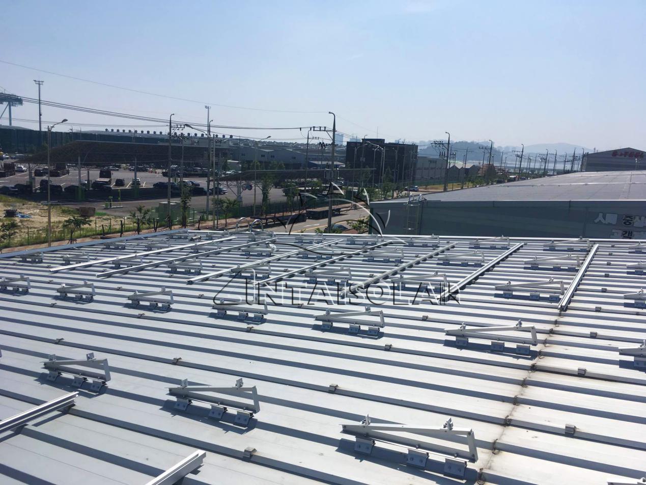 仁川港項目的屋頂類型為梯形彩鋼瓦,包含東西方向傾斜屋頂和南北方向傾斜屋頂,針對不同角度的屋頂,為了實現(xiàn)發(fā)電效率最大化,安泰工程師提供四種安裝解決方案,其中包括3種不同角度的三腳架;梯形夾具 + 三腳架 的支架方案在設(shè)計上極大地簡化了安裝步驟,從而大幅提升安裝效率,并且很大程度上為客戶減少了運輸和倉儲成本。