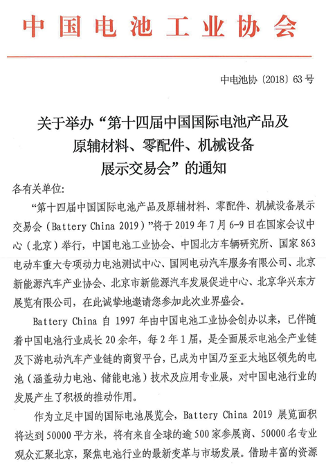 “第十四屆中國(guó)國(guó)際電池產(chǎn)品及原輔材料、零配件、機(jī)械設(shè)備展示交易會(huì)(Battery China 2019)”將于2019年7月6-9日在國(guó)家會(huì)議中心(北京)舉行,中國(guó)電池工業(yè)協(xié)會(huì)、中國(guó)北方車輛研究所、國(guó)家863電動(dòng)車重大專項(xiàng)動(dòng)力電池測(cè)試中心、國(guó)網(wǎng)電動(dòng)汽車服務(wù)有限公司、北京新能源汽車產(chǎn)業(yè)協(xié)會(huì)、北京市新能源汽車發(fā)展促進(jìn)中心、北京華興東方展覽有限公司,在此誠(chéng)摯地邀請(qǐng)您參加此次業(yè)界盛會(huì)。