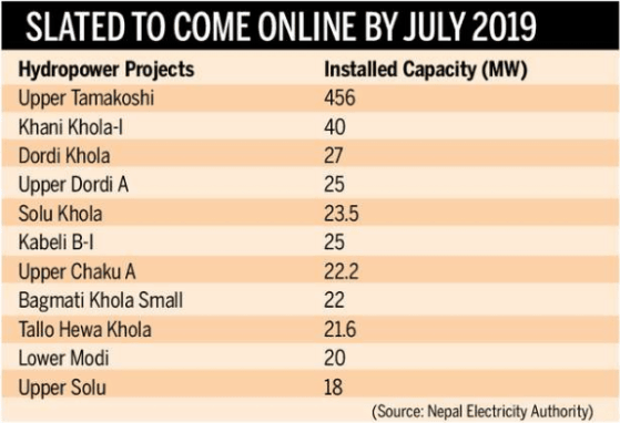 計劃上線的水電站是456兆瓦上Tamakoshi,40兆瓦Khani Khola-I,27兆瓦Dordi Khola,25兆瓦上Dordi A,23.5兆瓦Solu Khola,25兆瓦Kabeli BI,22.2兆瓦上Chaku A和22兆瓦巴格馬蒂科拉小,等等。