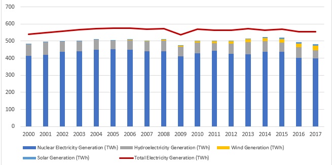 圖1.法國2000 - 2017年的發(fā)電量(按太瓦時計(jì)算)。