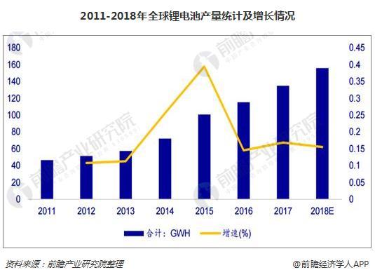 2011年以來(lái),由于能源技術(shù)變革以及新興科技的帶動(dòng)下,全球鋰離子電池產(chǎn)量進(jìn)入飛速增長(zhǎng)期,2012年到2015年增速均超過(guò)50%。2015年全球鋰電池產(chǎn)量100.75GWh,同比增長(zhǎng)39.45%;2017年,鋰離子電池主要應(yīng)用市場(chǎng)增速放緩,增速只有16.85%,但受益于新能源汽車行業(yè)景氣帶動(dòng)的動(dòng)力電池繁榮,預(yù)計(jì)2018年全球鋰電池增速維穩(wěn),產(chǎn)量有望達(dá)到155.82GWH,市場(chǎng)規(guī)模將到達(dá)2313.26億元。