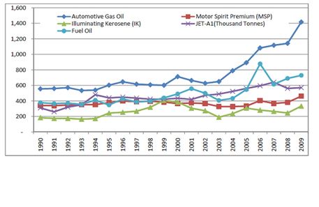 石油是肯尼亞商業能源的主要來源,多年來,石油占該國商業能源需求的約80%。2006年,肯尼亞銷售了440萬立方米的石油產品。這42萬米3是煤油和68000米3是LPG。肯尼亞的石油消費總量從2003年的260萬立方米增加到2006年的373萬立方米。消費量保持上升趨勢。截至2009年,對石油產品的需求量為3,656千噸。截至2007年,肯尼亞有一家煉油廠,蒙巴薩煉油廠,其銘牌產能為每天90,000桶。自其委托以來,煉油廠尚未滿負荷運轉。