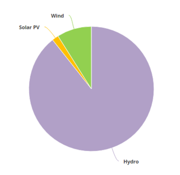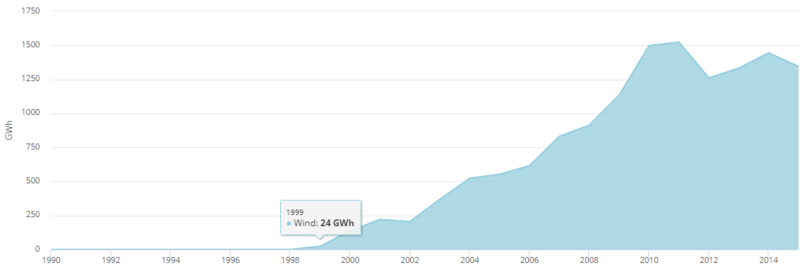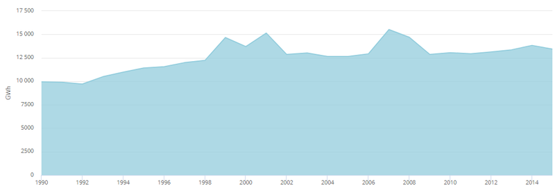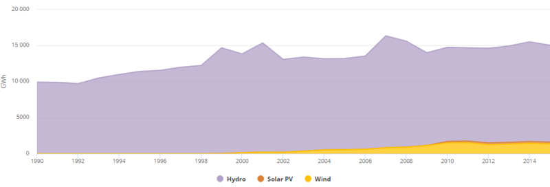 2012年,可再生能源發(fā)電量達(dá)到14,855 GWh [18],占總發(fā)電量的9.04%。水力發(fā)電裝置產(chǎn)生13,358吉瓦時(shí)(8.13%),而風(fēng)力發(fā)電又貢獻(xiàn)了1,260吉瓦時(shí)(0.77%)和太陽(yáng)能光伏發(fā)電237吉瓦時(shí)(0.14%)。