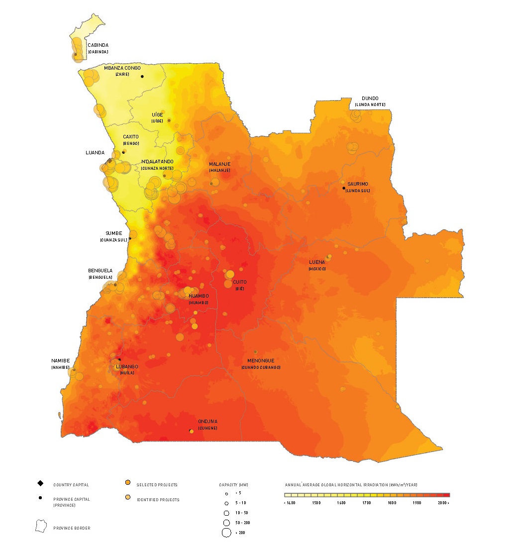 下圖顯示了安哥拉太陽能資源圖集以及確定具有安裝多個(gè)太陽能光伏項(xiàng)目GW的巨大潛力的各個(gè)地點(diǎn)。它還包括選擇用于安裝連接到主電網(wǎng)的78兆瓦的站點(diǎn),包括中型和大型項(xiàng)目,這些都是達(dá)到既定的100兆瓦目標(biāo)所必需的。這些地點(diǎn)的選擇是因?yàn)樗鼈兊哪茉闯杀据^低,主要位于該國(guó)的中部和南部。