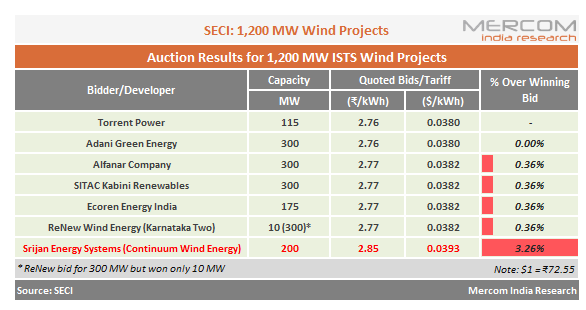 Mercom 之前曾報(bào)道,9個(gè)項(xiàng)目開發(fā)商提交了總計(jì)2,190兆瓦的技術(shù)出價(jià),其中SECI的Tranche-V ISTS連接風(fēng)電標(biāo)簽的容量為1200兆瓦。
