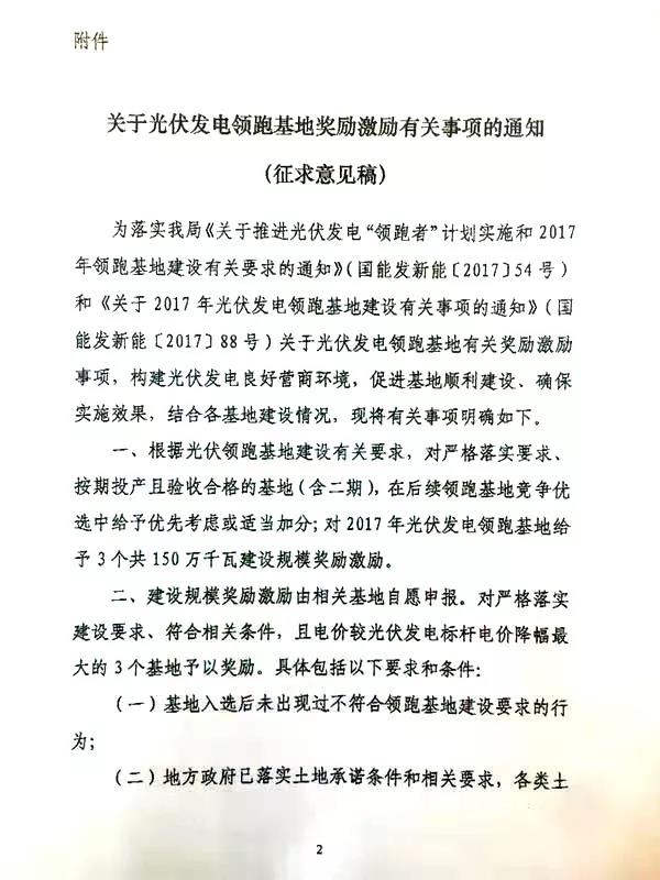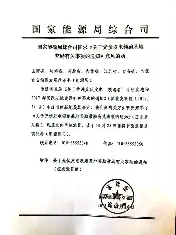 從國家能源局綜合司處獲悉,該局在日前印發(fā)了征求《關(guān)于光伏發(fā)電領(lǐng)跑基地獎(jiǎng)勵(lì)有關(guān)事項(xiàng)的通知》意見的函,就國能發(fā)新能【2017】54號(hào)中提出的領(lǐng)跑者基地獎(jiǎng)勵(lì)事宜征求相關(guān)發(fā)改委(能源局)的意見。