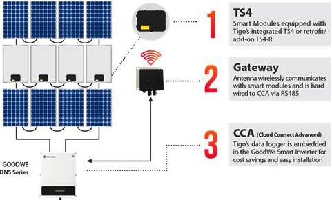 固德威聯(lián)合Tigo推出的此快速關(guān)斷型逆變器簡化的解決方案完全適用于復(fù)雜的系統(tǒng)設(shè)計(jì)和局部遮陽情況。TigoTS4平臺(tái)為固德威DNS和SDT逆變器提供了關(guān)機(jī)代碼,使逆變器遵從模塊級(jí)診斷,能最大化收集能源,兩者無縫協(xié)作。