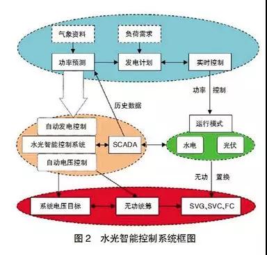 主要研究內(nèi)容。一是“水光互補”自動運行控制技術(shù)研究。根據(jù)水電和光伏電站的運行特點,研究水電光伏自動發(fā)電控制(AGC)和自動電壓控制(AVC)的控制模式、負荷優(yōu)化分配策略及保護閉鎖邏輯。研究在水光協(xié)調(diào)互補運行模式下,滿足電網(wǎng)發(fā)電要求,以最大限度利用太陽能、減少棄水和棄光為目標的光伏與水電AGC、AVC的聯(lián)合控制模型和控制策略。