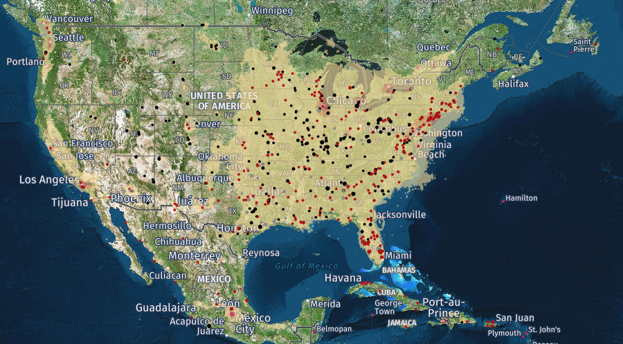 美國NO2污染。彩色圓點(diǎn)代表發(fā)電廠。彩色的云顯示該地區(qū)的二氧化氮水平。云越深或越粉,濃度越高。