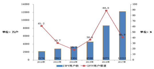 加快培育新興業(yè)務(wù),扎實(shí)提高IPTV、物聯(lián)網(wǎng)、智慧家庭等服務(wù)能力。2017年末,IPTV用戶數(shù)達(dá)到1.22億戶,全年凈增3545萬戶,凈增用戶占光纖接入凈增用戶總數(shù)的53.5%。