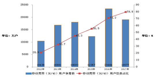 2012-2017年移動寬帶用戶(3G/4G)發(fā)展情況