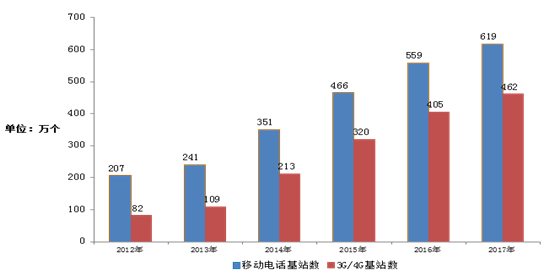 2017年,三大運(yùn)營商著力提升網(wǎng)絡(luò)品質(zhì),加快光纖網(wǎng)絡(luò)建設(shè),完善4G網(wǎng)絡(luò)覆蓋深度,不斷消除覆蓋盲點(diǎn),移動網(wǎng)絡(luò)服務(wù)質(zhì)量和覆蓋范圍繼續(xù)提升。2017年,全國凈增移動通信基站59.3萬個,總數(shù)達(dá)619萬個,是2012年的3倍。其中4G基站凈增65.2萬個,總數(shù)達(dá)到328萬個。