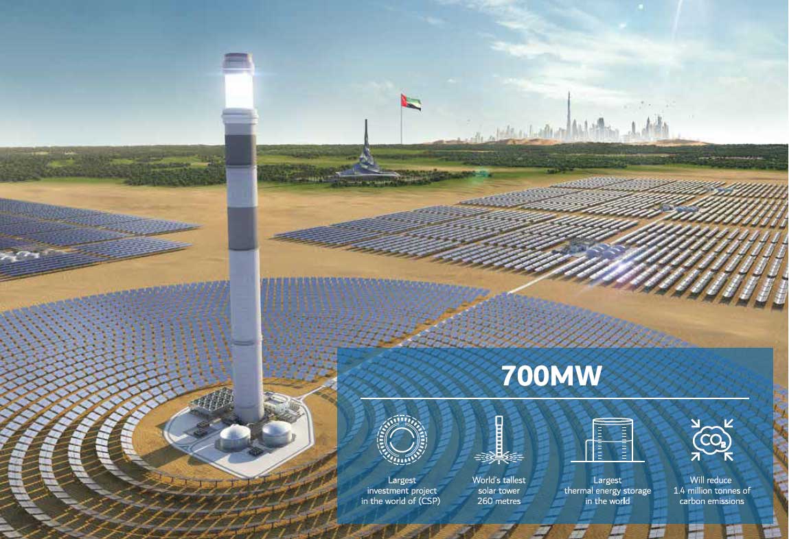 項目建成后每年將產(chǎn)生70萬千瓦清潔電力配備世界上最大的儲熱能力,能夠為迪拜270000多家住戶提供清潔電力,每年減少140萬噸碳排放量。